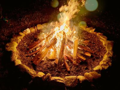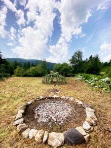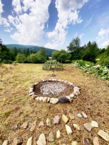 Die Feuerstelle haben wir komplett erneuert und etwas größer eingerichtet. In der Abtrennung zum weiten Feld haben wir Büsche und Sträucher gesetzt, um den Platz auch von dieser Seite einzurahmen und zu behüten. (auf den beiden anderen Seiten fließt ja bereits die Lonka als Begrenzung. Somit ist der Platz nun von fließendem Wasser und Blütensträuchern umgeben.