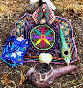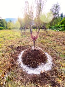 Die Wasserqualität des Platzes führte dazu, dass die Erdstäbe der Schwitzhütte ausgetrieben haben und ein 3 m hoher Weidendom vor uns stand. Diese wunderbare Manifestation der Kraft des Lebens der Pflanzen wollten wir nicht zerstören, indem wir die Zweige geschnitten hätten. Vielmehr haben wir das Gerüst erneuert und die Weiden nun in das System der Schwitzhütte eingeflochten. Somit wird über die Zeit eine "lebendige" Schwitzhütte entstehen, welche immer weiter wächst.